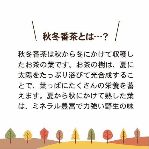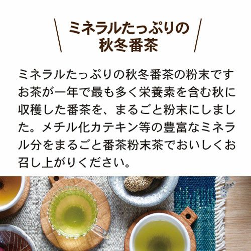 他の画像を見る 葉っピイ向島園 まるごと番茶粉末茶(40g)向島園 ¥ 540 税込 一年で最も多くの栄養素を含む秋に収穫した、秋冬番茶の粉末です。 まるごと粉末にしているので、番茶の栄養成分をそのまま飲むことでがでます。 カートに入れる お気に入りに登録する