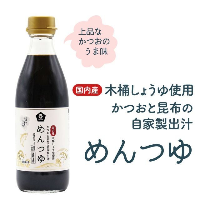 他の画像を見る かつお節と昆布の自家製だし使用 めんつゆ・国内産木桶しょうゆ使用 360ml(ムソー) ¥ 680 税込 伝統的な木桶仕込み天然醸造の醤油をベースに、かつお節と昆布の自家製だしを加えためんつゆです。3倍希釈。 カートに入れる お気に入りに登録する