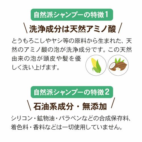 とうもろこしやヤシ等の原料から生まれた、天然のアミノ酸の泡が洗浄成分です。この天然由来の泡が頭皮や髪を優しく洗い上げます。