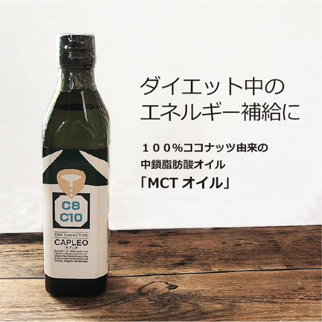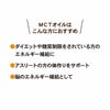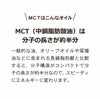 MCT(中鎖脂肪酸)とはココナッツや母乳などに含まれている天然の脂肪酸です。MCTオイルは中鎖脂肪酸100%でできており、一般的なオリーブオイルなどの長鎖脂肪酸よりも分子が小さい。そのため、水に溶けやすく分解されやすい特徴があり、一般的な油よりも4倍ほど早くエネルギーに変わります。
