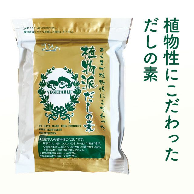 鰹や鯖などの魚類及び動物性の原料を一切使うことなく、植物性だけのもので作られた“だし”です。