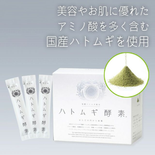 「はとむぎ酵素」は、美容によいアミノ酸を多く含む4種類の国産ハトムギと、綺麗とお腹の健康をサポートするフルーツ酵素、オリゴ糖、乳酸菌FK-23の7種類の原料をブレンドした「体の内からきれい」を提案する美容サプリメントです。