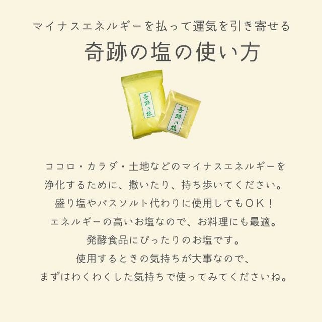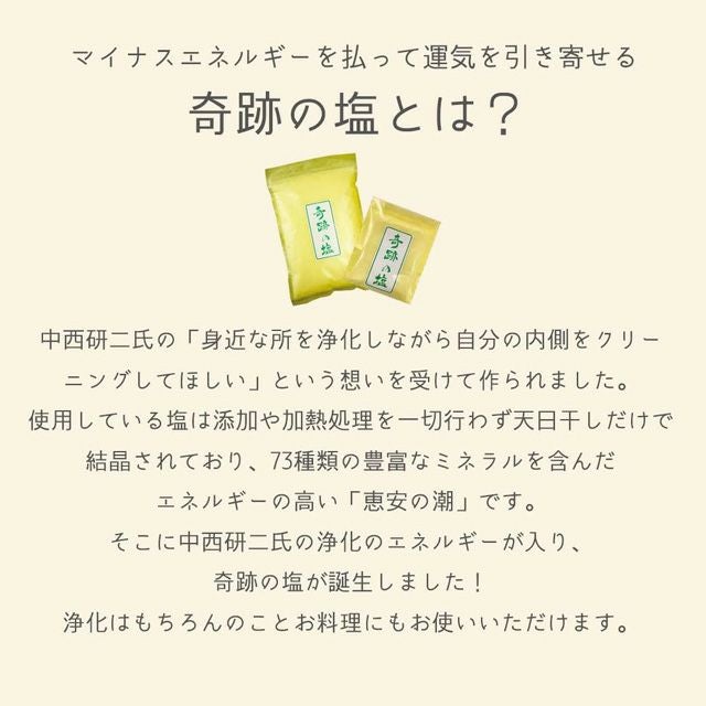 他の画像を見る 開運・強運・浄化に 奇跡の塩 天然塩、お清め、浄化、開運、盛り塩に ¥ 257 税込 〜 ¥ 税込 浄化エネルギーが入った「奇跡の塩」であなたの身近な環境を浄化することは、あなたの内側の浄化につながります。 詳細を見る お気に入りに登録する