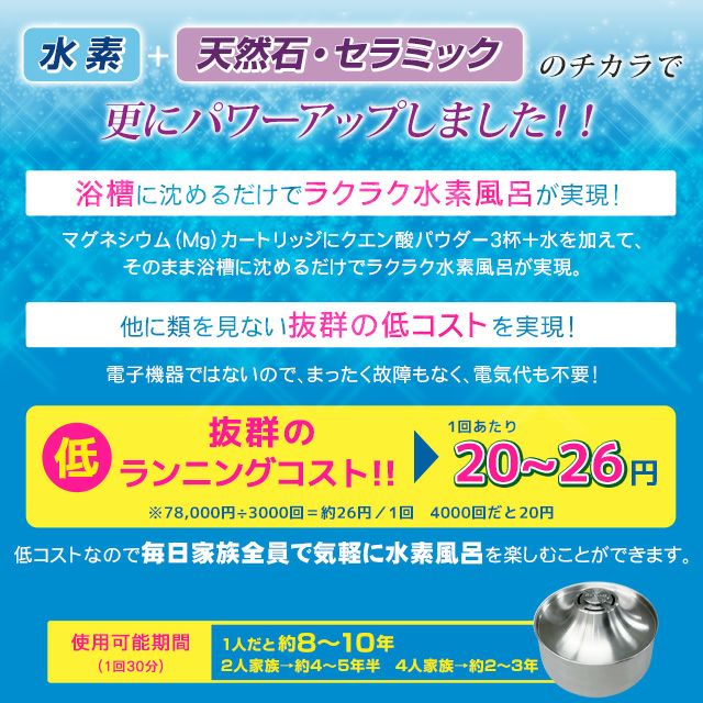 他の画像を見る 水素風呂で美容と健康をサポート 水素入浴習慣「Super Re・lax α(スーパーリラックスアルファ)」【送料無料】 ¥ 85,800 税込 高濃度水素を全身で吸収できる水素風呂。1回の入浴で水素水3Lの3倍以上の量を体内に取り込むことができます。 カートに入れる お気に入りに登録する