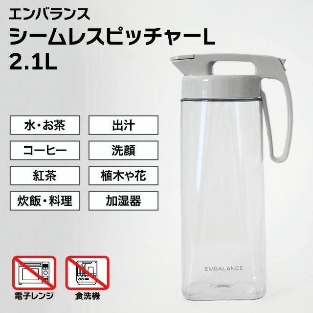 他の画像を見る 横置き可能!冷蔵庫収納に便利な保存容器 エンバランス シームレスピッチャーL(2.1L) ¥ 3,850 税込 エンバランス シームレスピッチャーLは、水を美味しく保つ特殊加工を施した保存容器。2.1Lの大容量で、縦置き・横置きどちらも可能。ワンタッチ開閉の注ぎ口で使いやすく、お手入れも簡単。環境に優しいBPAフリー素材を使用し、安心して長く使えます。 カートに入れる お気に入りに登録する