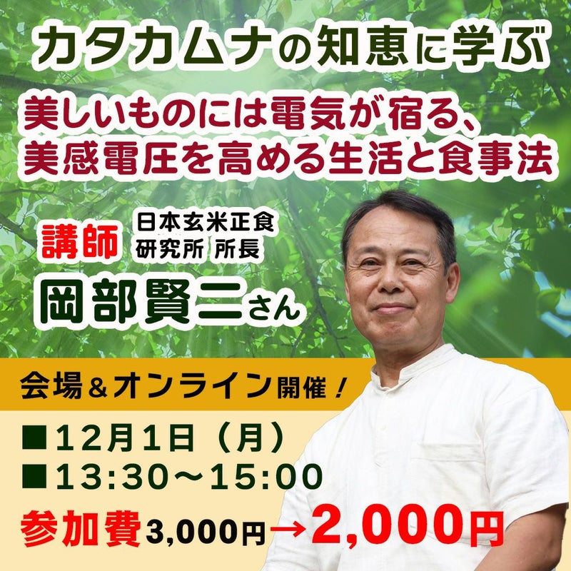 他の画像を見る 【アーカイブ】岡部賢二セミナー 2025年12月1日(月) 【アーカイブ販売】カタカムナの知恵に学ぶ■美しいものには電気が宿る、美感電圧を高める生活と食事法(講師・岡部賢二) 定価 ¥ 3,000 のところ ¥ 2,000 税込 岡部賢二氏によるZoomセミナー。カタカムナの知恵から学ぶ■美しいものには電気が宿る、美感電圧を高める生活と食事法! カートに入れる お気に入りに登録する