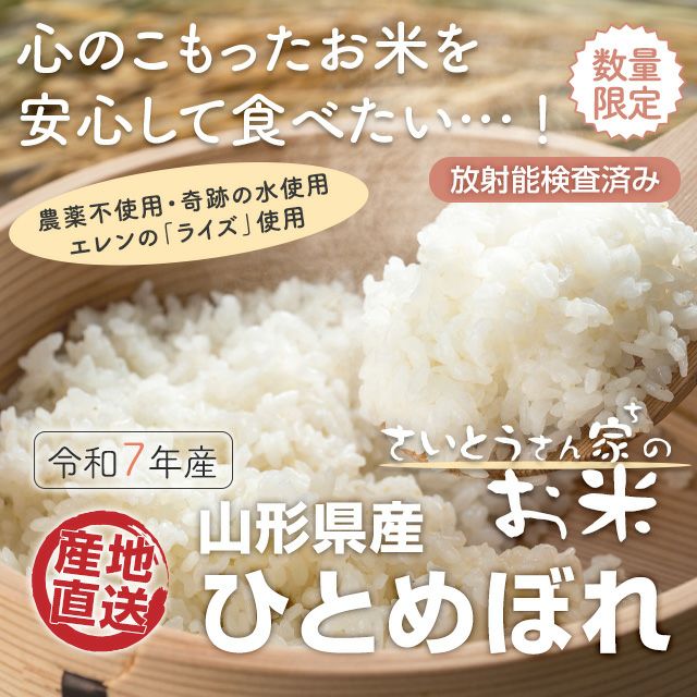 他の画像を見る 令和7年産【ひとめぼれ】さいとう米(玄米・白米)山形県産 【農薬不使用】 産地直送 新着 こちらは予約商品です ¥ 8,640 税込 〜 ¥ 税込 安心して心のこもったお米を食べたい!手間ひま惜しまず、こだわりの農薬不使用。エレンのライズ(蘇生・稲作用エレン)使用。出羽三山の霊山「月山」の水を引いています。 詳細を見る お気に入りに登録する