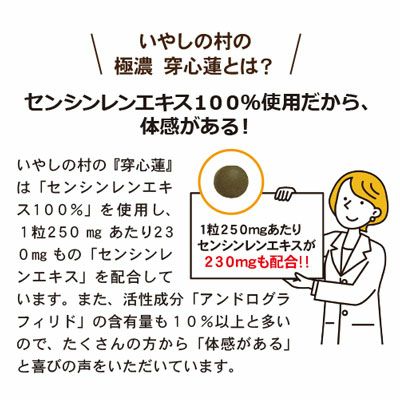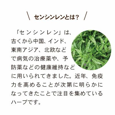 他の画像を見る 世界が注目する驚異の天然ハーブ 【定期購入】【ポイント3倍・10%OFF】極濃・穿心蓮エキス粒(センシンレン)【送料無料】 ポイント3倍 10%OFF 定期販売 定期購入 1回あたり ¥ 4,374 税込 穿心蓮(センシンレン)の茎と葉は古くから有効な植物として、インドや中国など、古くから親しまれており、古来アーユルベーダなどで伝統的に使用されてきた歴史のあるハーブです。 詳細を見る お気に入りに登録する
