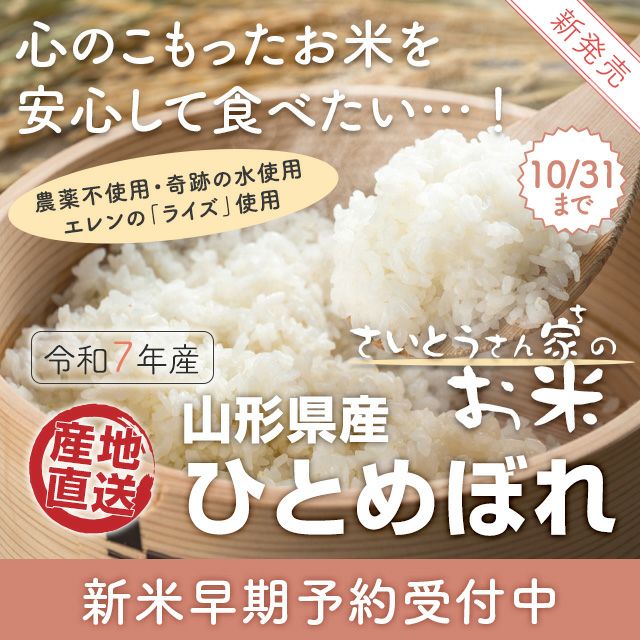 他の画像を見る 新米早期予約スタート! 令和7年産【ひとめぼれ】さいとう米(玄米・白米)山形県産 【農薬不使用】10月中旬より順次発送【新米早期予約10/31まで】 予約商品 産地直送 新着 こちらは予約商品です ¥ 4,320 税込 〜 ¥ 税込 予約在庫切れ 安心して心のこもったお米を食べたい!手間ひま惜しまず、こだわりの農薬不使用。エレンのライズ(蘇生・稲作用エレン)使用。出羽三山の霊山「月山」の水を引いています。 詳細を見る お気に入りに登録する