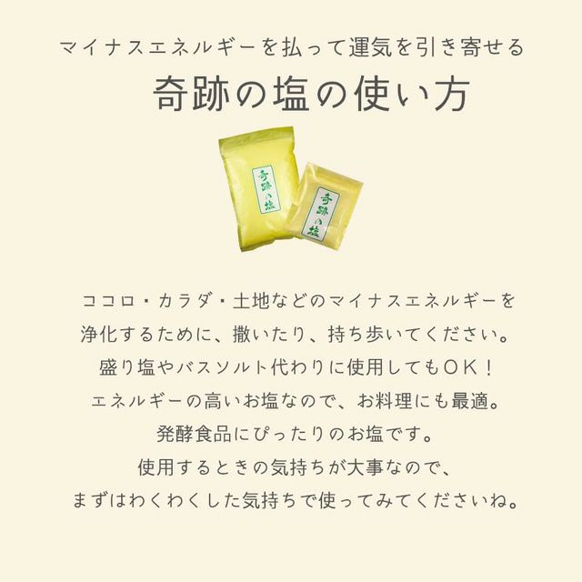 他の画像を見る 開運・強運・浄化に 奇跡の塩 天然塩、お清め、浄化、開運、盛り塩に 新着 8%OFF ¥ 257 税込 〜 ¥ 税込 浄化エネルギーが入った「奇跡の塩」であなたの身近な環境を浄化することは、あなたの内側の浄化につながります。 詳細を見る お気に入りに登録する