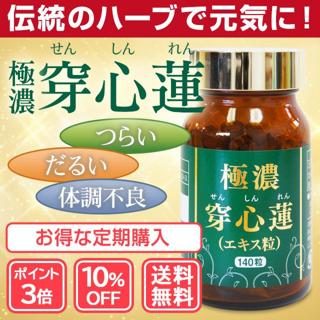 他の画像を見る 世界が注目する驚異の天然ハーブ 【定期購入】【ポイント3倍・10%OFF】極濃・穿心蓮エキス粒(センシンレン)【送料無料】 ポイント3倍 10%OFF 定期販売 定期購入 1回あたり ¥ 4,374 税込 穿心蓮(センシンレン)の茎と葉は古くから有効な植物として、インドや中国など、古くから親しまれており、古来アーユルベーダなどで伝統的に使用されてきた歴史のあるハーブです。 詳細を見る お気に入りに登録する