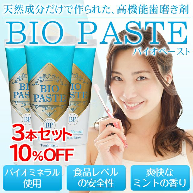 他の画像を見る 食品レベルの安全性!天然成分100%の歯磨き粉 バイオペースト(歯磨き粉) セット割引 ¥ 1,848 税込 〜 ¥ 税込 バイオペーストは、天然成分だけで作られた高機能歯磨き剤です。食品レベルの安全性ですので、万が一飲み込んでも安心です。石油由来の成分や研磨剤などは含まず、天然由来の成分で歯の汚れを落とし、口腔内の健康を保ちます。 詳細を見る お気に入りに登録する