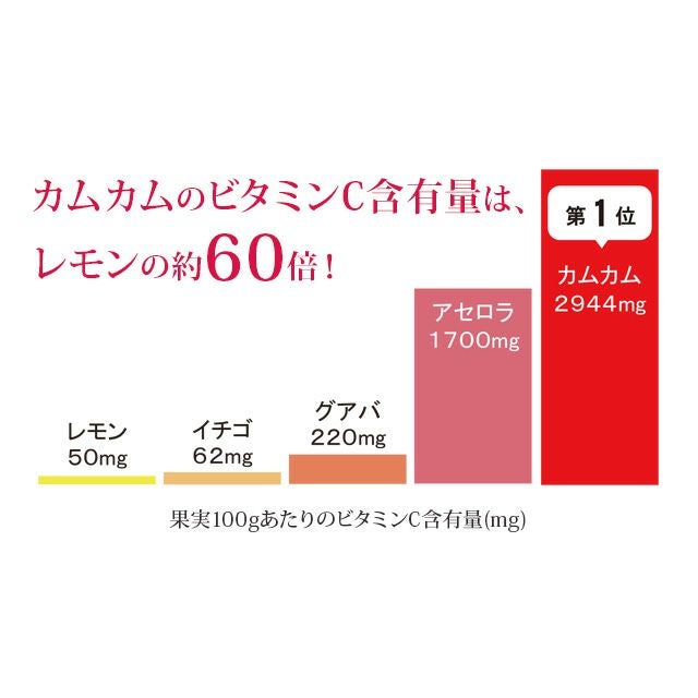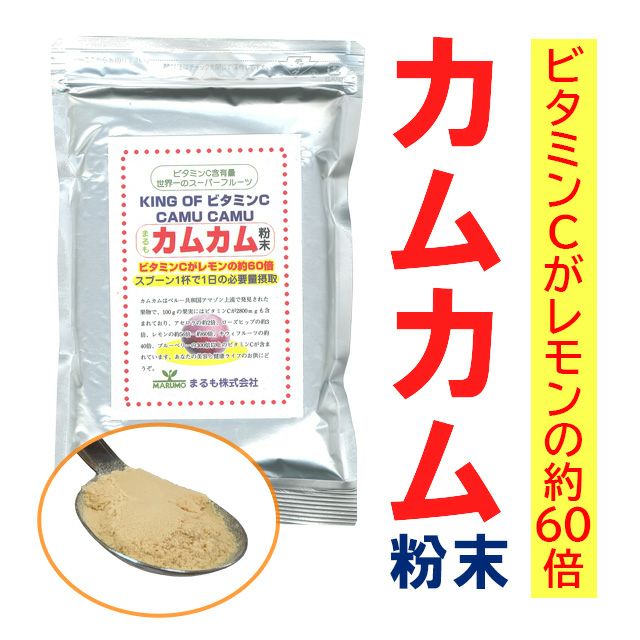 他の画像を見る 天然ビタミンCの含有量で世界一 まるも カムカム粉末(ビタミンC)70g ¥ 2,700 税込 カムカムは、ペルー共和国アマゾン上流で発見された果物で、100gの果実にはビタミンCが2800mgも含まれており、ビタミンCの含有量では世界一を誇るスーパーフルーツと呼ばれています。 カートに入れる お気に入りに登録する