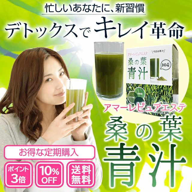 他の画像を見る 【定期購入】【ポイント3倍・10%OFF】アマーレピュアエステ 桑の葉青汁【送料無料】 ポイント3倍 10%OFF 定期販売 定期購入 1回あたり ¥ 3,790 税込 野菜不足の日本人におすすめ!「桑の葉青汁」は、野菜不足を補うために、国産の桑の葉と大麦若葉と2つの青汁を使っています。 詳細を見る お気に入りに登録する