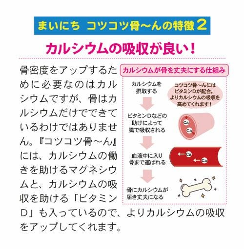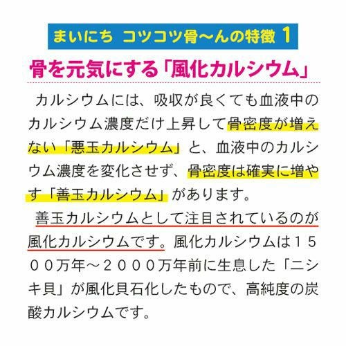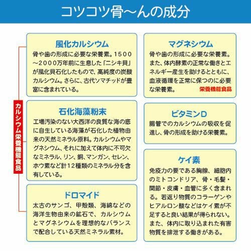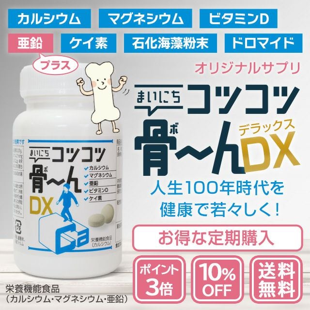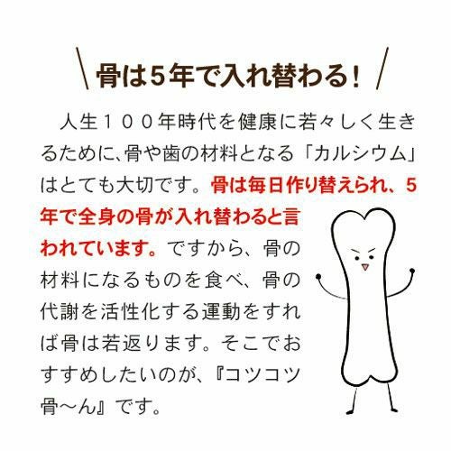 他の画像を見る 骨のチカラが若さの秘訣! 【定期購入】【ポイント3倍・10%OFF】まいにち コツコツ骨~んDX(300粒)【送料無料】(こつこつぼーん) ポイント3倍 10%OFF 定期販売 定期購入 1回あたり ¥ 4,482 税込 老け顔に見えるほうれい線やあごのたるみも、骨密度の低下によるものだった!骨は毎日作り替えられ、5年で全身の骨が入れ替わるといわれています。今からカルシウム貯蓄をはじめて、いつまでも若々しさを保ちましょう! 詳細を見る お気に入りに登録する