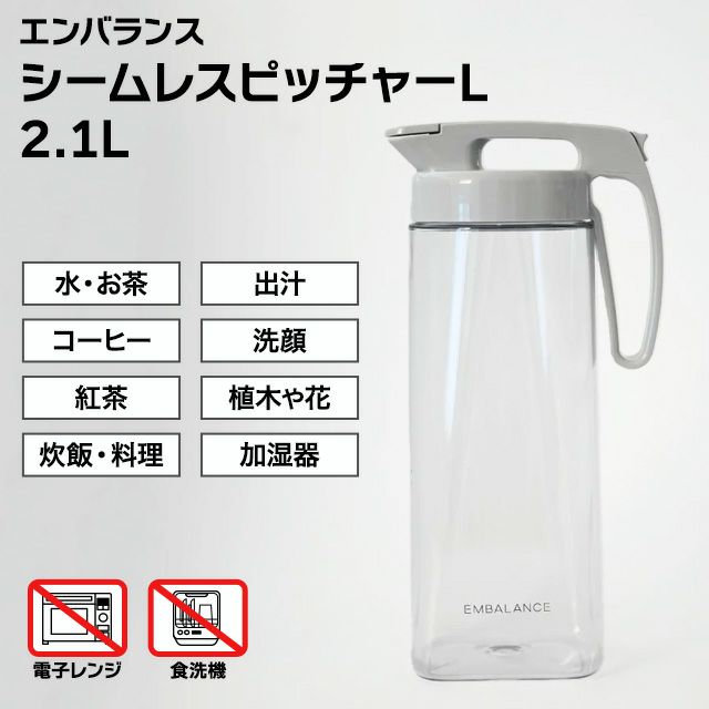 エンバランスピッチャーは、お水の保存はもちろん、お茶やコーヒー、炊飯やお料理など、掃除用の水や植木の水やり、加湿器・洗顔用の水など、さまざまな用途にお使いいただけます。