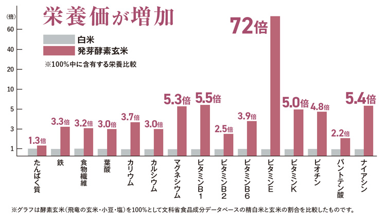 発芽酵素玄米と白米を比べると、上のグラフのように、栄養価がまるで違います。さらに、発芽することでGABAという成分が白米の約3倍に増えます。これは脳内の血流を活発にし、血圧を安定させ、さらにはストレスを軽減させてくれる働きがあるそうです。