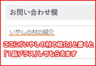 ご注文の際、お問合せ欄に「いやしの村の紹介」と書くと「1品プラス」してもらえます。