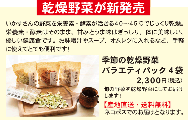 いかすの宅配はワンサイズ。今、食べてほしい、選りすぐりの旬のお野菜10袋をセットにしています。旬の野菜をお届けします。