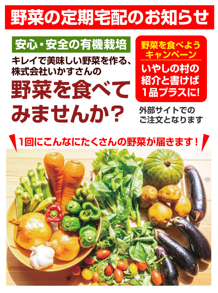 ご注文時に「いやしの村の紹介」と書けば、野菜が1品プラスになります!