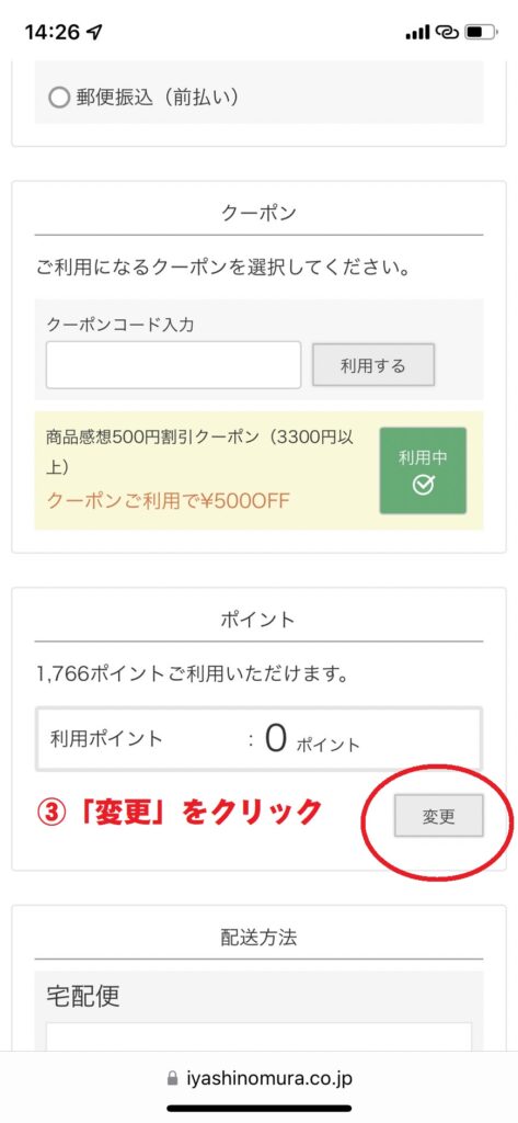 3.ポイントの欄の「変更」をクリック