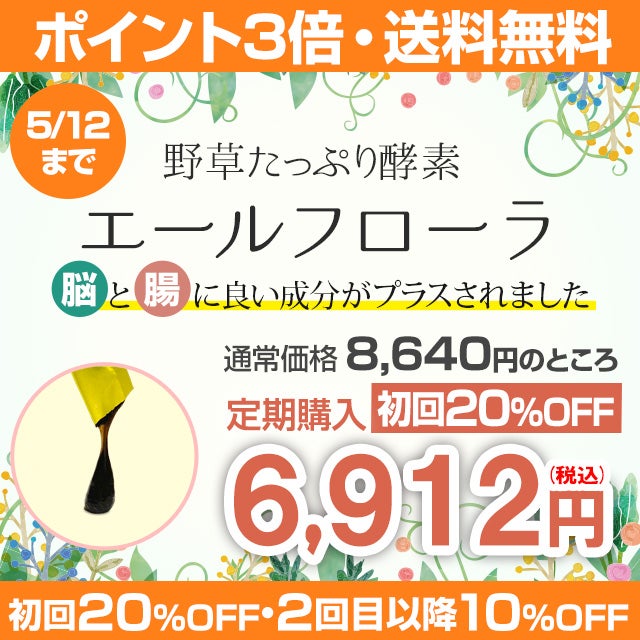 他の画像を見る 野草酵素スーパーCPDXがリニューアル 野草たっぷり酵素 エールフローラ【定期購入】【送料無料・初回20%OFF】10gx30包 定期販売 初回特別価格あり 定期購入 1回あたり ¥ 7,776 税込 販売期間 2026/03/24 0:00 〜 2026/05/12 23:59 野草酵素スーパーCPDXがリニューアル。野草たっぷり!はこれまでと一緒!80種類の原料を使った「生きた酵素」! 詳細を見る お気に入りに登録する